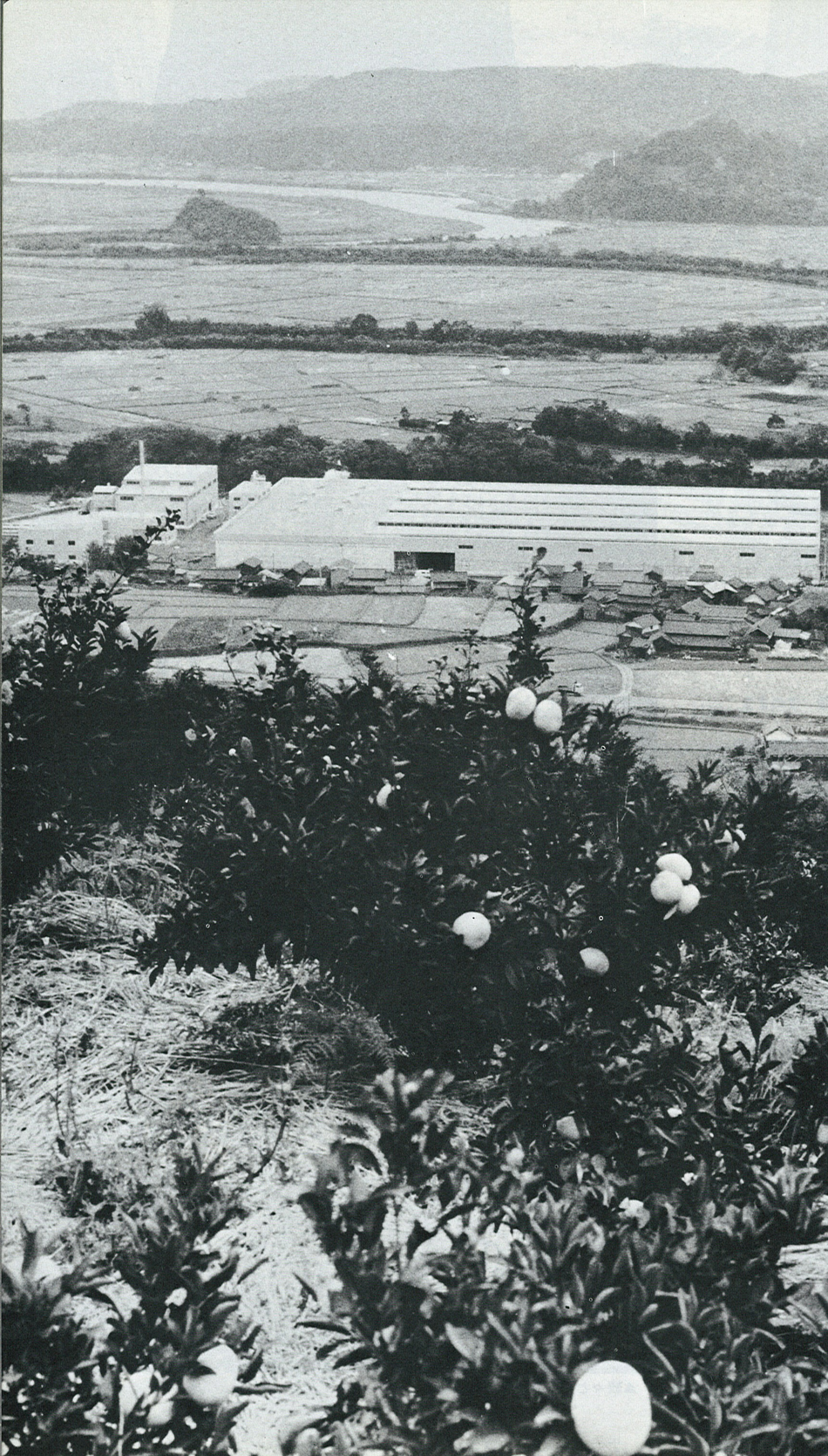 当時のみかん生産農家をはじめとする果樹農業者が待ち望んでいた県果実連杵築工場が、昭和47年に完成した。写真は八坂川のほとりでオレンジ色にかがやく工場全景。昭和47年杵築市本庄にて撮影。