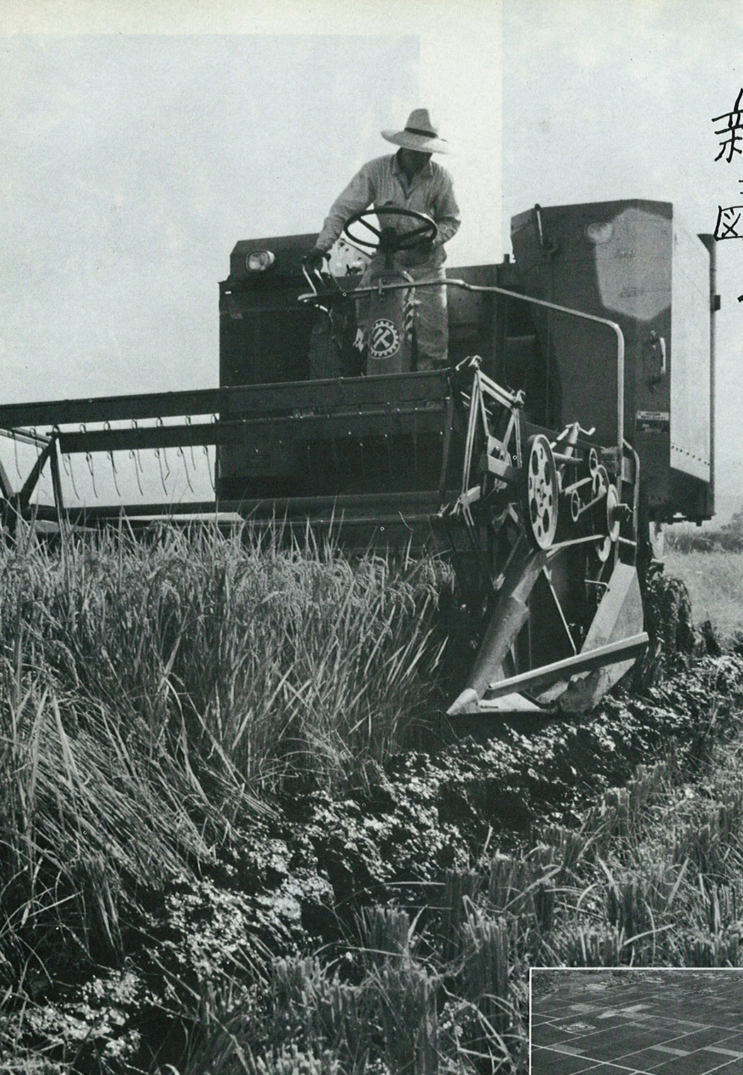 たくましい響きをあげて進んだコンバイン。1時間に25アールの稲を刈り取り、脱穀まで同時にすましてしまった。当時、労働力の減少や、雇用労賃の高騰に対処して、農業の機械化はいちじるしくすすんだ。