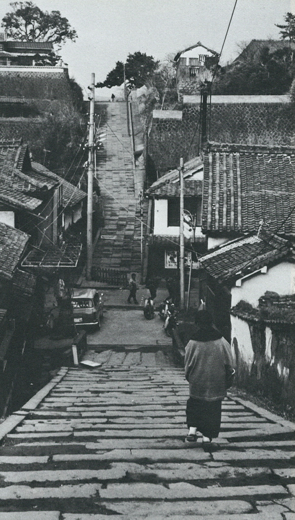 昭和48年。当時の杵築市の北台と南台を結ぶ坂道には風情があった。切り石の石段がかなりの急勾配で、せりあがるように伸びて。狭い町並みをうまく構成していた。スラム化の新興都市に比べてより人間的な町並みであるといわれた。