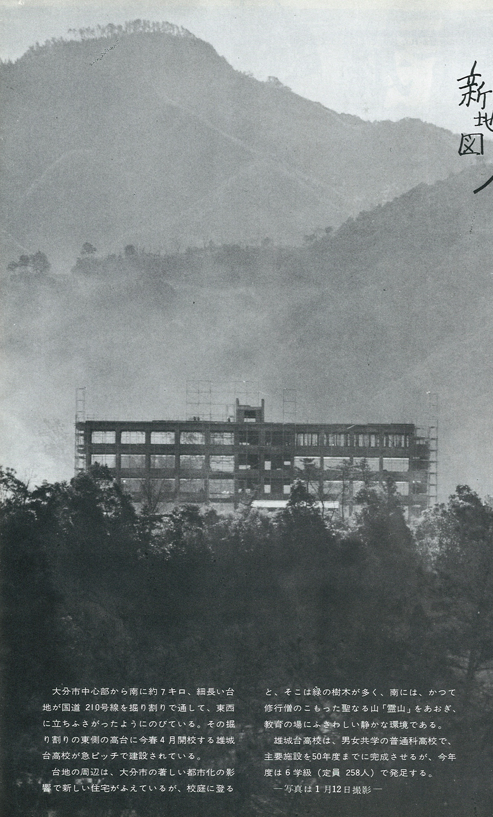 大分市中心部から南に約7キロ、東側の高台に雄城台高校はある。周辺には緑の樹木が多く、南にはかつて修行僧のこもった聖なる山「霊山」をあおぎ、教育の場にふさわしい静かな環境である。