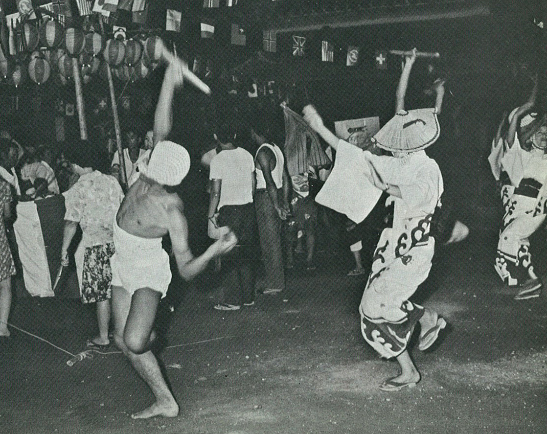 姫島村では、8月1日から4日間は「盆坪」と呼ばれる踊り場が島のあちこちに建てられ、盆踊りが熱狂的に繰り広げられる。“娘まねくにゃあの船ゃ待たぬ、思い切れとの風が吹く”、“思い切れとは死ねとのことか、思い切りょか増す恋を” 網笠姿の女が柔らかな手の動きで優美に踊る間をぬって、裸の男が二本の竹筒を激しく打ち鳴らしながら、掛け声も勇ましく前後左右に飛び交う。人情の機微を巧みに表現している。