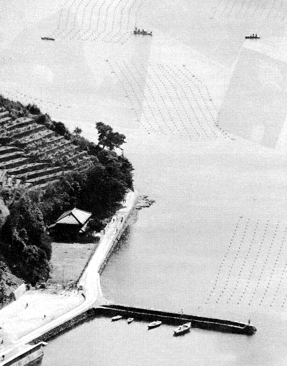 昭和48年12月4日、日豊海岸の国定公園指定が決まった。日豊海岸は旧佐賀関から宮崎県日向市美々津海岸に至る直線総延長120キロの海岸で、大小の島々が点在し、半島や湾、絶壁が連続したリアス式海岸が特徴。公園区域は大分県が全体の半分以上を占めている。写真は、静かな入江に美しいしま模様を描いた真珠養殖のいかだ(昭和49年 佐伯市米水津)。