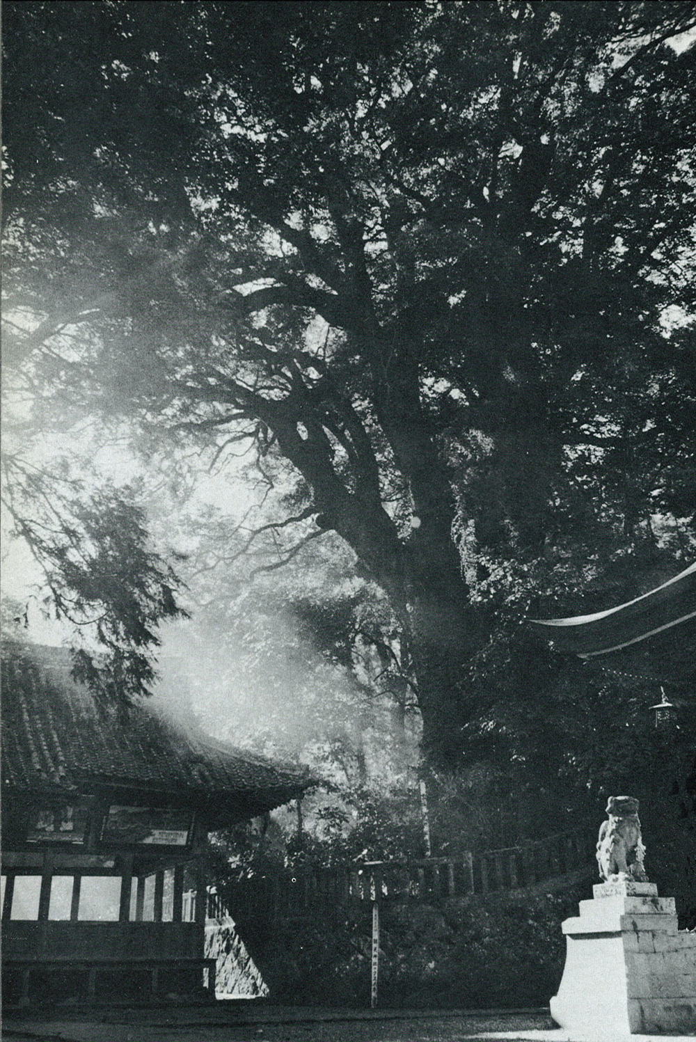 うっそうとした森が社殿をおおうようにそびえており、このうち、ひときわ大きいクスノキは、樹齢1000年、樹高30メートル、胸高周囲7メートルもあった。当時、この森とクスノキは、近く県が特別保護樹林と樹木にそれぞれ指定する予定であった。