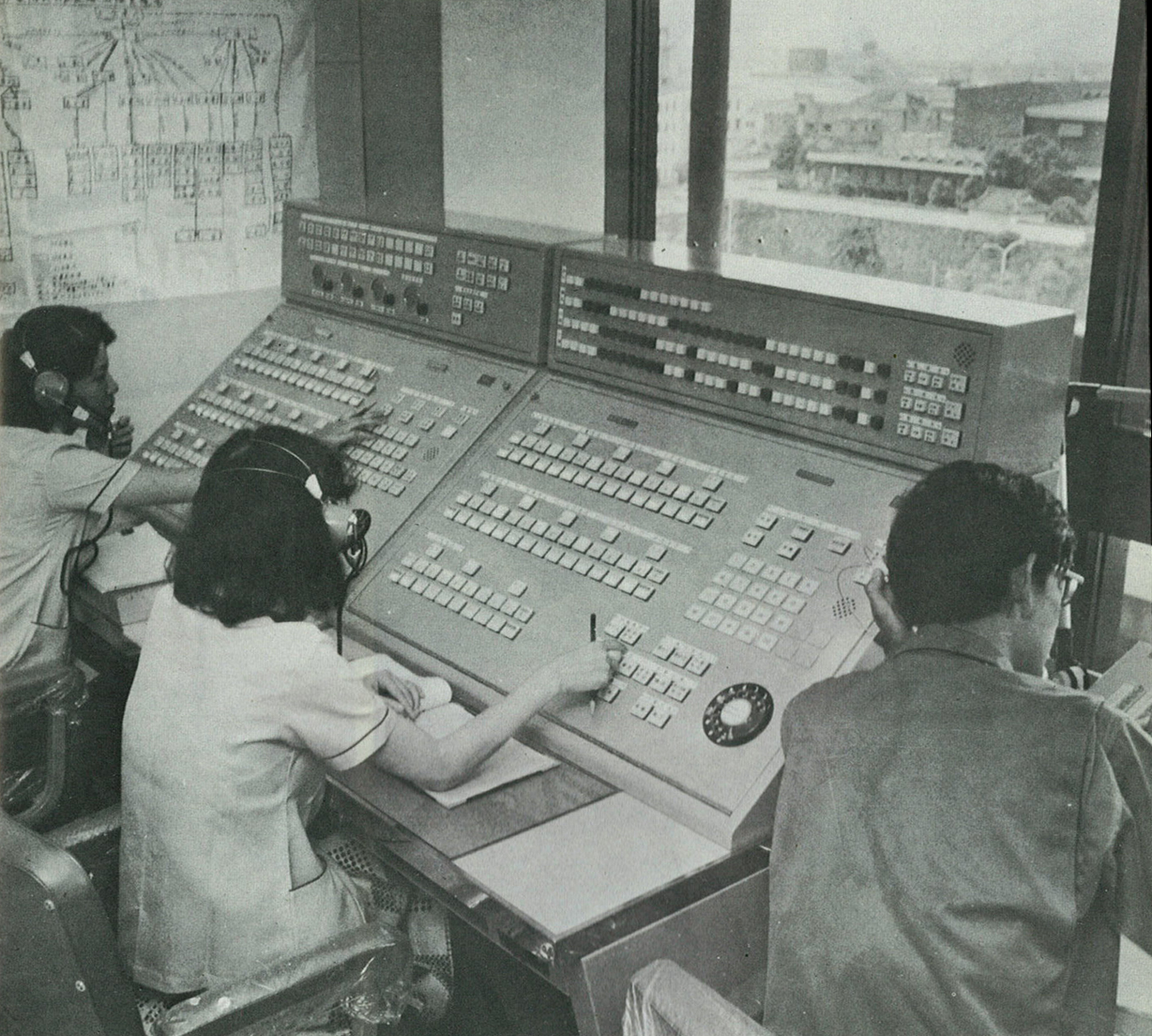 当時、着々と整備されていた防災行政無線網。その要となる県庁8階の統制室。不慮の事態にそなえ、2重3重の回線経路を備えて万全を期していた。