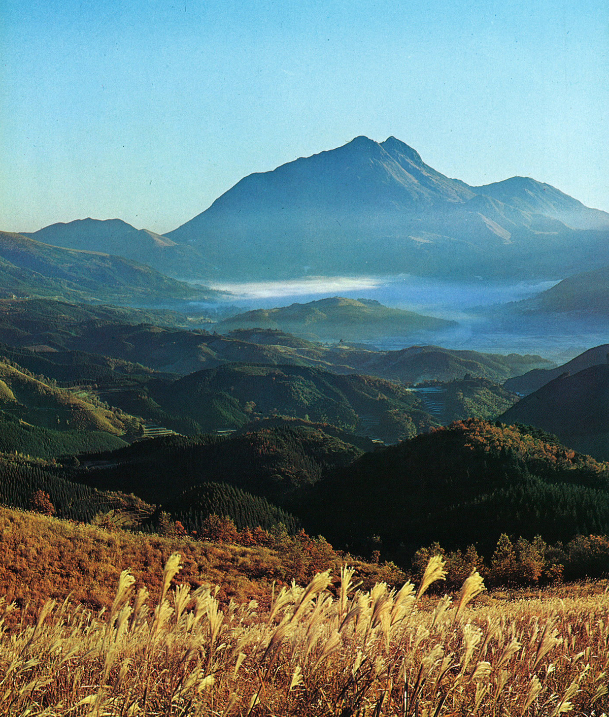 真綿を盆地の上に張りつめたような濃い朝霧。周りの谷々にも、しみこむように広がっていた。霧の下には、由布院温泉の家並みがあった。
