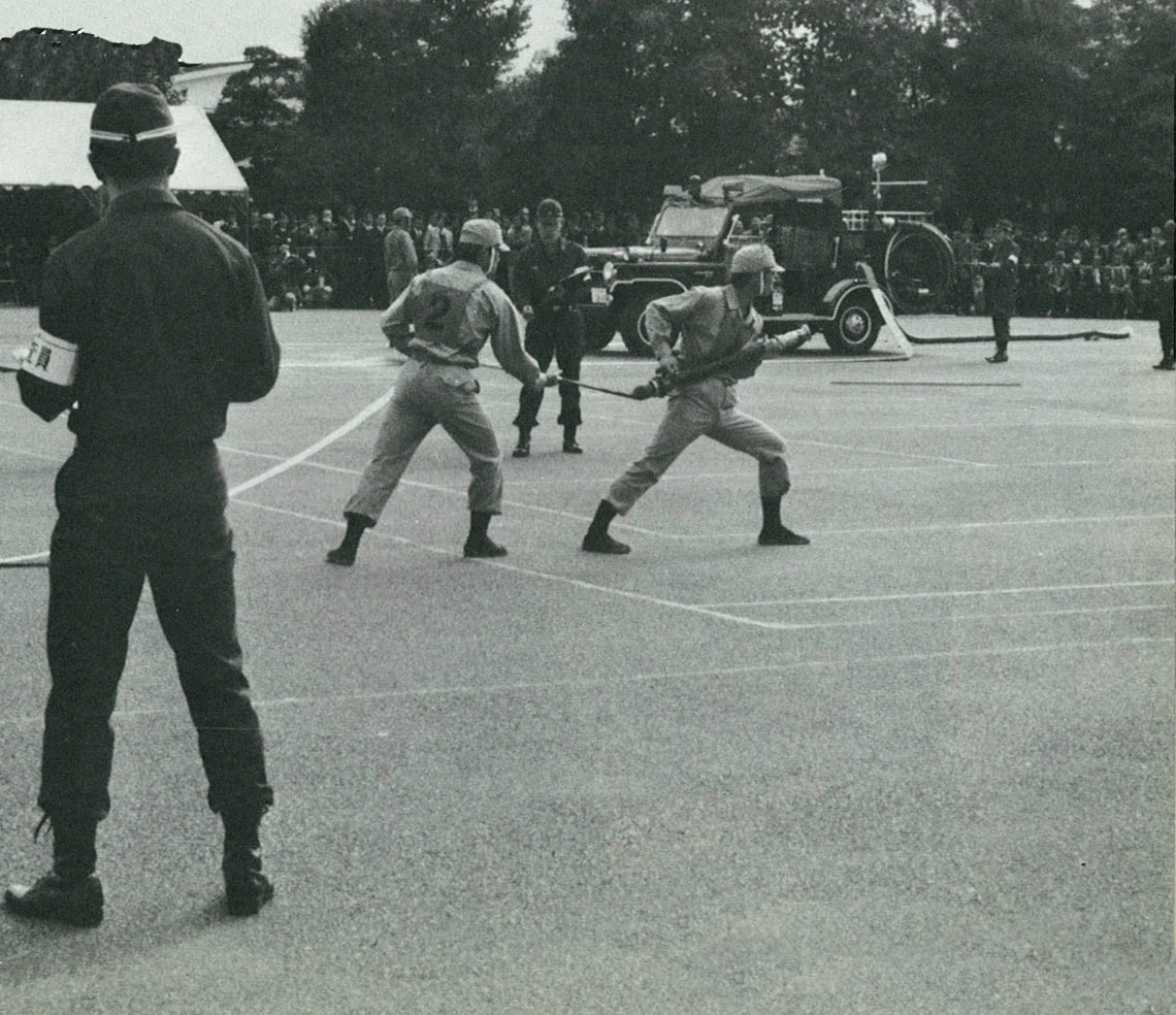 昭和49年11月2日、東京で開催された第4回全国消防操法大会で、見事準優勝の栄誉に輝いた佐伯市宇目消防団。この朗報は、単に消防団だけの誇りでなく、町あげての大きな喜びとなった。写真は全国大会で小型ポンプ操法の融資。