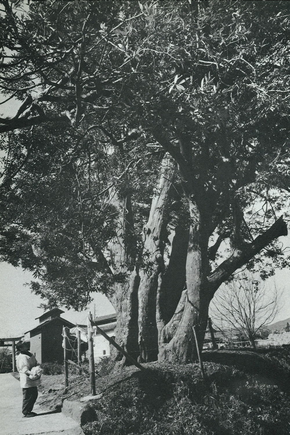 豊後大野市三重町の中心部から車で10分ほどの静かな山あいの里。神社の鳥居脇に繁るこの“なぎ”の木は、県指定の天然記念物で、当時、樹齢1,200年といわれていた。