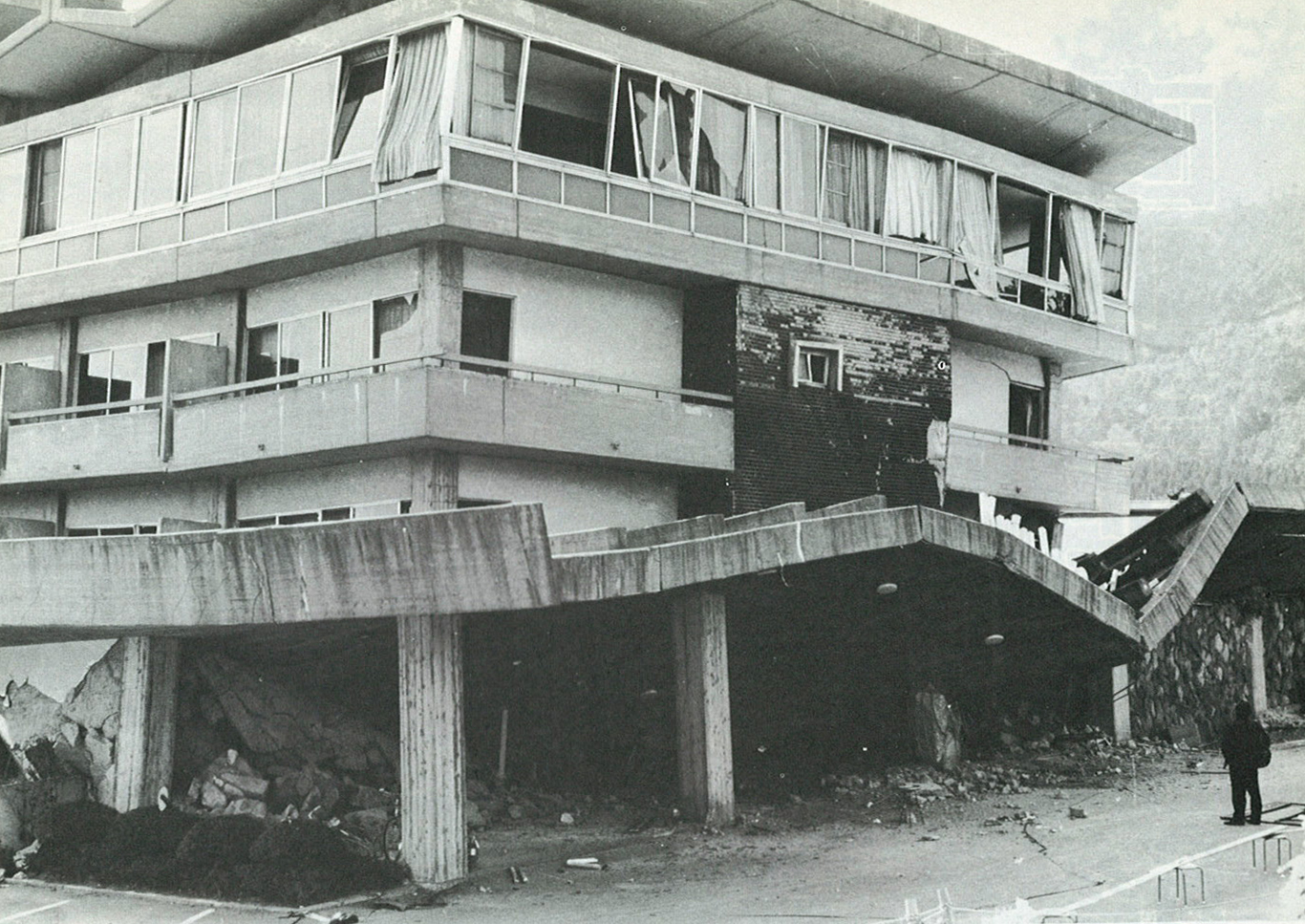 地割れした九州横断道路。昭和50年4月21日未明、県中部を直撃した“直下型地震”は、庄内、湯布院、直入、九重町の4町を中心に大きな被害をもたらし、人びとを不安のどん底におとし入れた。同年5月10日、重軽傷者22人を含め、被害総額は約66億円にも達した。写真は地震の上下動で建物の一部が押しつぶされたホテル(由布市湯布院町山下湖畔)。