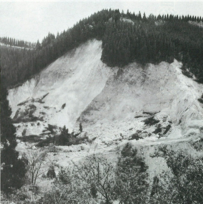 地割れした九州横断道路。昭和50年4月21日未明、県中部を直撃した“直下型地震”は、庄内、湯布院、直入、九重町の4町を中心に大きな被害をもたらし、人びとを不安のどん底におとし入れた。同年5月10日、重軽傷者22人を含め、被害総額は約66億円にも達した。写真は崩壊した杉山(九重町奥双石(おくなめし))。