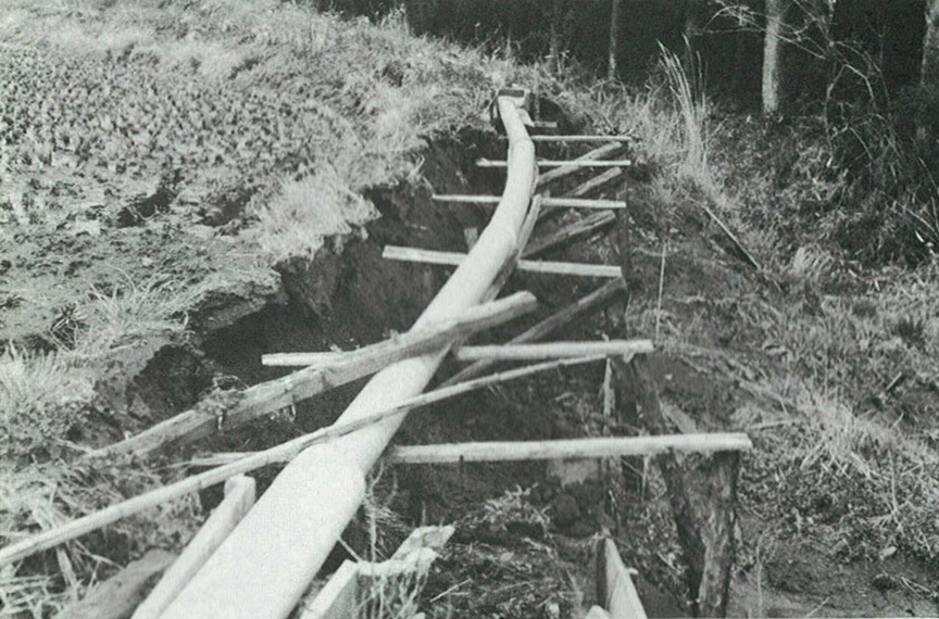 地割れした九州横断道路。昭和50年4月21日未明、県中部を直撃した“直下型地震”は、庄内、湯布院、直入、九重町の4町を中心に大きな被害をもたらし、人びとを不安のどん底におとし入れた。同年5月10日、重軽傷者22人を含め、被害総額は約66億円にも達した。写真は大きな被害を受けた水田。こわれた水田にはビニールパイプをと渡すなど植え付け不能田の解消に全力がつくされた。(九重町千町無田)