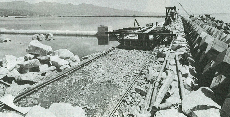 当時の大分県の公共下水道普及率は、わずかに5.2パーセント(50年3月末現在)で全国平均よりかなり低い。しかし、大分市をはじめとする都市部で事業が本格化、急ピッチの工事が進められた。写真は別府市中央浄化センター建設地の埋め立て工事のようす。