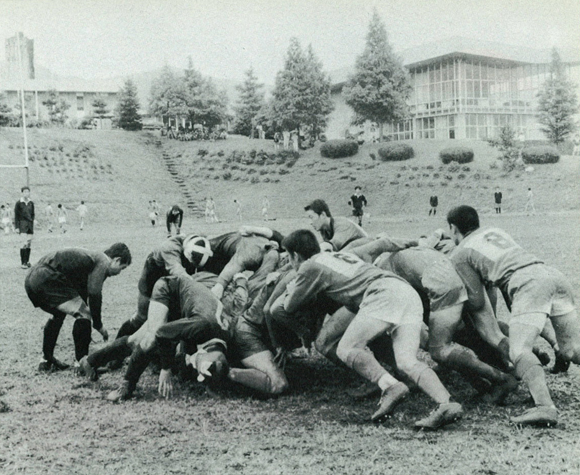 当時の湯布院青少年スポーツセンターでのラグビー合宿風景である。昭和41年、約4億円を投じて日本体育協会が全国に先がけて設置した。このような本格的な「総合体育施設」は全国各ブロック11か所に設置されたが、当時の九州地区では大分県のみであった。