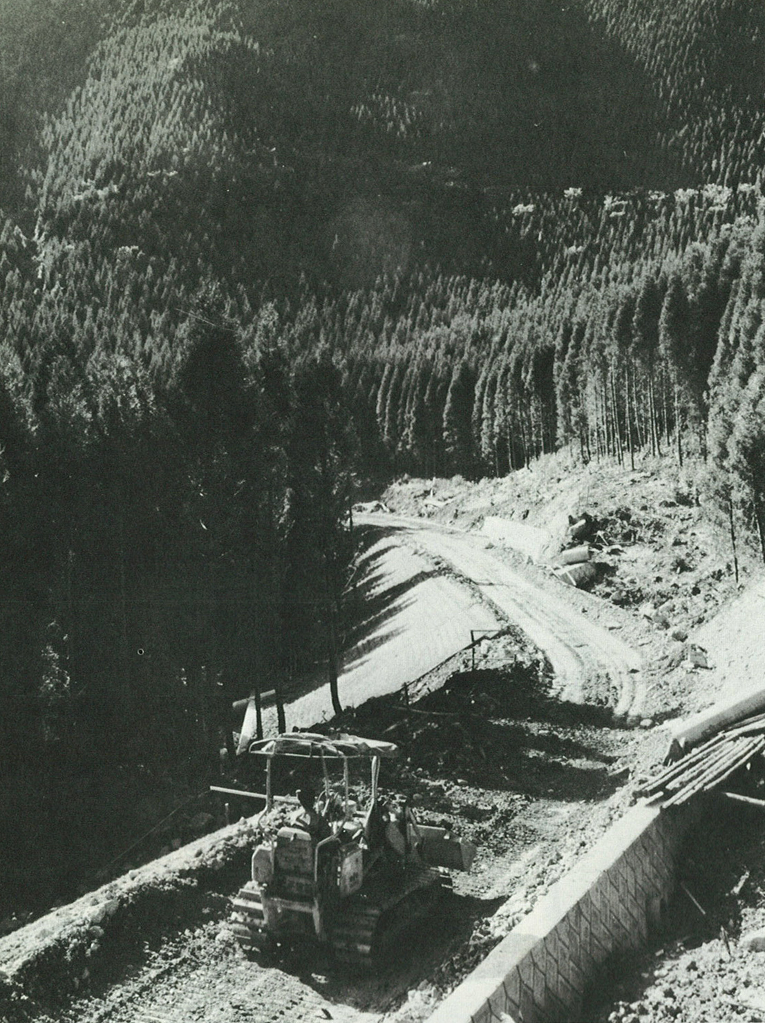 昭和50年、奥日田スーパー林道は、林業の振興や山村の生活道路として大きな役割を果たす林道と期待されていた。(建設中の奥日田スーパー林道)