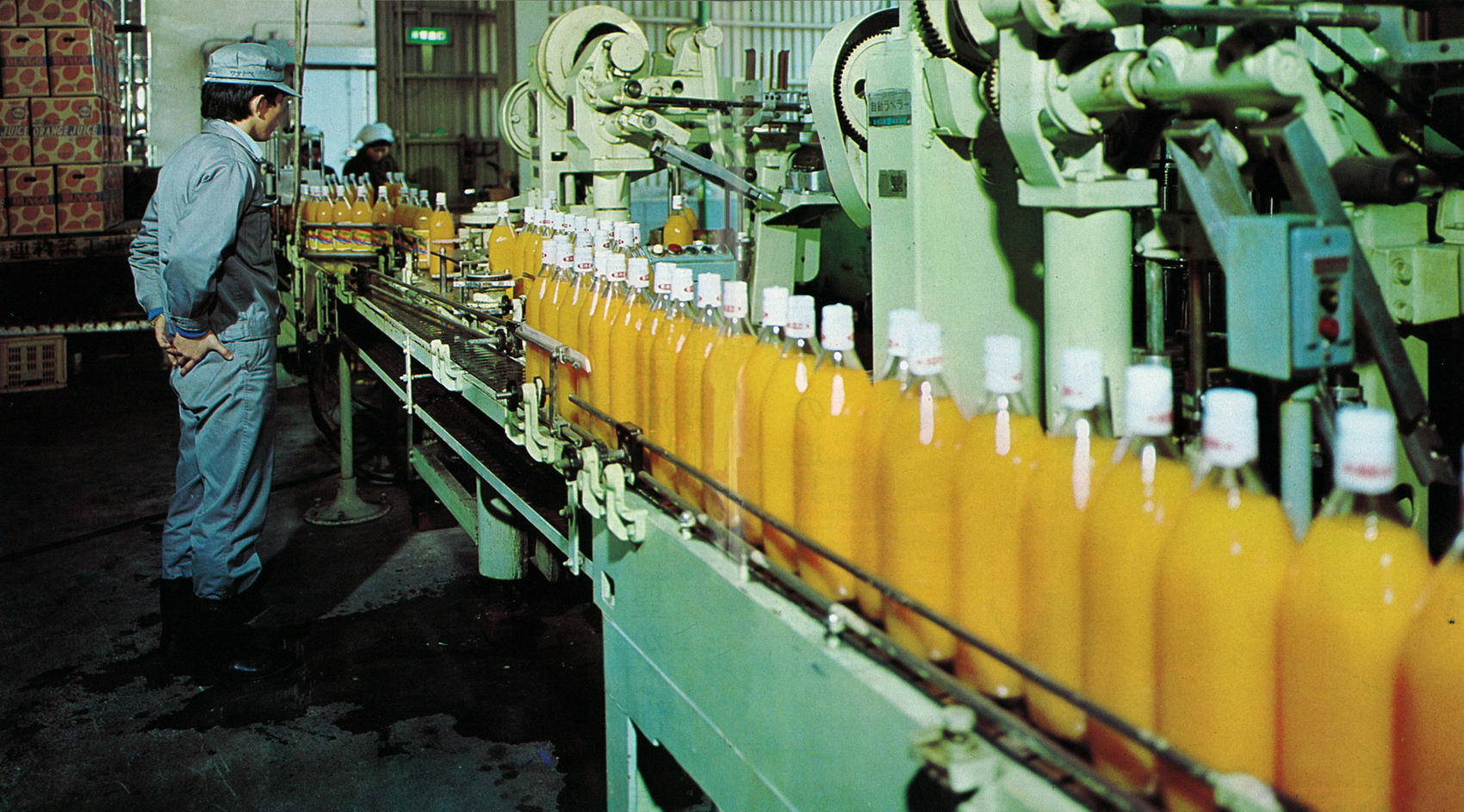 果汁100%のぶんごジュースのビンが1日2万本生産されたという県果実農業協同組合連合会の杵築工場。ぶんごオレンジジュースは、南国の太陽をいっぱいに浴びた新鮮なみかんをしぼり、添加物はもとより砂糖も水も入ってない、まったくの天然果汁。コップ1杯がみかん5個分にあたり、生みかんの風味、栄養が、たっぷり生かされていた。当時、ぶんごオレンジジュースの味は、市場での評価が向上していき、また、栄養豊富な自然食品として、県内の学校給食に取り入れられたりもした。
