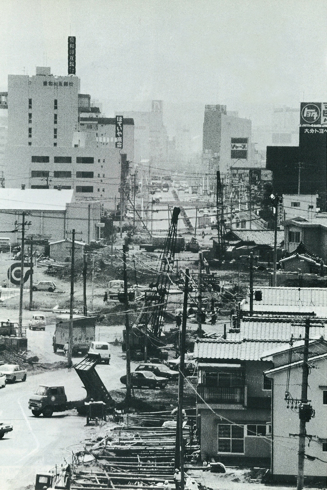大分市の中心部を通り抜ける国道10号線西大分地区。当時行われた工事のようす。