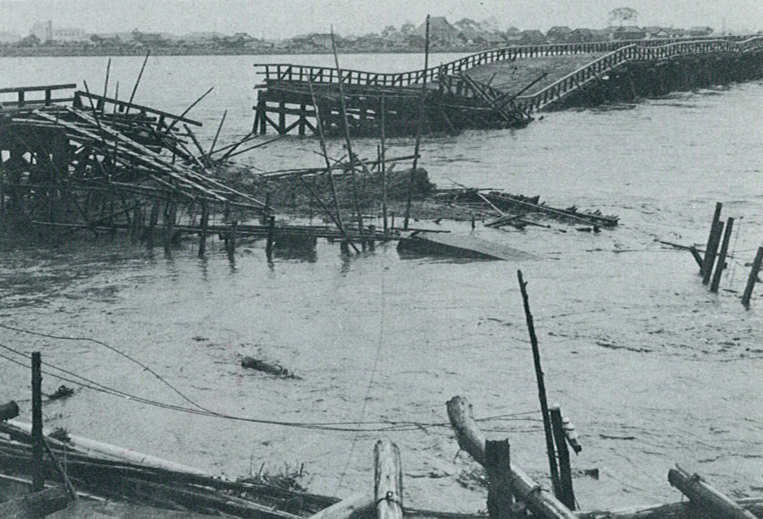 戦後の再建に、度重なる風水害は大きな打撃であった。(流失寸前の大分市舞鶴橋・昭和28年)
