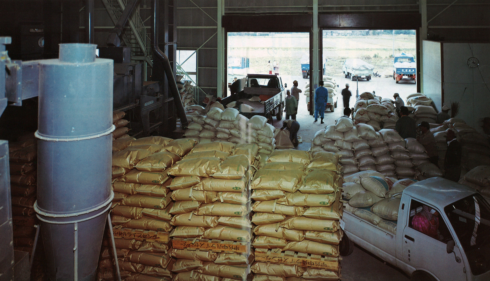 宇佐市の四日市中央ライスセンター。四日市、八幡、糸口の三つの農協の共同利用施設である。荷受した生もみを乾燥し、もみすり、検査、袋詰めと、一貫作業で処理していく。荷受は稲刈りシーズンの約25日間に集中し、約50日間ですべての作業を完了する。毎日、70~80トンの生もみが持ち込まれるが、当時は兼業農家が増えたため、土曜、日曜日には約180トンが夜遅くまで持ち込まれ、ライスセンターは大忙しであったという。