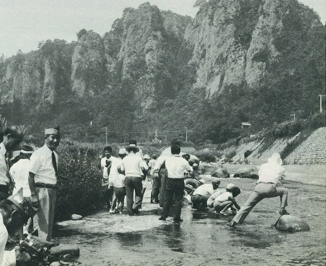 豊かな恵みの安心院盆地をたたえ、収穫感謝祭「盆地祭り」のようす。行事は前夜祭と本祭に分かれ、こい、スッポンの供養放流、各種功労者の表彰、五穀豊穣祈願祭、子供みこし、小・中学生のブラスバンド演奏、仮装行列、変装踊りと多種多様な催しに、町民は日ごろの苦労を忘れてこの日を祝い、町内ばかりか、他町村からの見物客も訪れた。