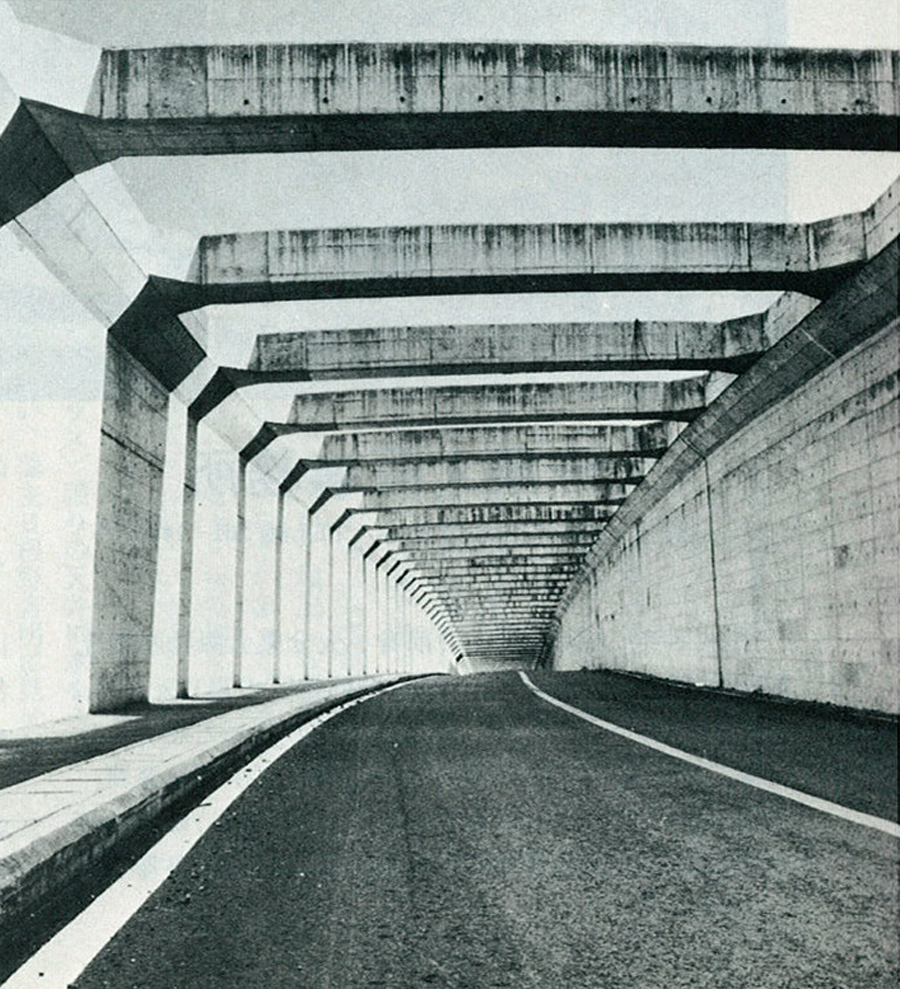 当時、臼杵、津久見間を走る国道217号線は、道幅が狭く、とくに両市を分ける臼津峠付近は。急坂、急カーブの連続で、ドライバー泣かせで名高い難所であった。写真は側壁の崩壊を防ぐ安全性の高い箱型道路。当時県下で初めて取り入れた。