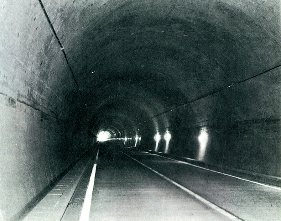 臼津バイパスは、臼杵市福良を起点に津久見市青江まで7.15キロメートルの2車線道路区間には1,649メートルの臼津トンネルをはじめ、4本のトンネル、12箇所521メートルの橋などかなりの難工事であった。写真は当時、県下最長の臼津トンネル(1,649メートル)。トンネルを抜けると津久見の石灰山が見えてくる。