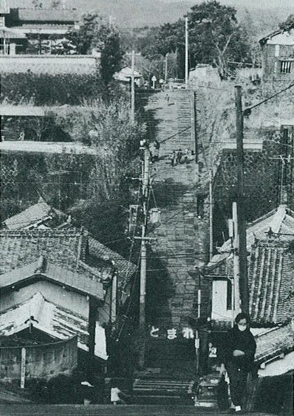 昭和50年。当時、文化財保護法か改正され、歴史的な集落、町並みが「伝統的建造物群」として文化財に定義され、保存される制度が生まれた。しかし、集落、町並みは個々の文化財保護と異なり、多くの問題が残されている。なぜなら、集落、町並みは、そこに多くの人たちが暮らしている「生きた文化財」だからである。保存か消滅かは、そこに住む人たちの意思に大きく左右された。手前の坂道の石段は自動車のために舗装された。