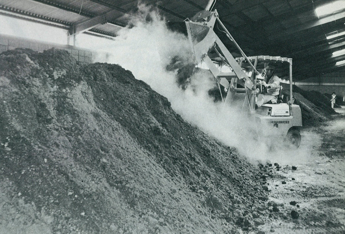 大分県では昭和52年度から、それまで以上に良質野菜の生産拡大に力を入れ、栽培ハウスの積極的な造成、生産の基礎となる土壌づくり、地域ごとに品目を決めた集団産地の育成など、流通の合理化などで強力な銘柄作りを推し進めた。写真は当時、九州一の規模という大分市東部畜産環境保全組合の「土壌改良センター」。畜産農家から集めた堆きゅう肥にオガクズを混ぜて発酵させる。製品は農協を通して市内の農家へ出荷された。(大分市松ヶ丘)