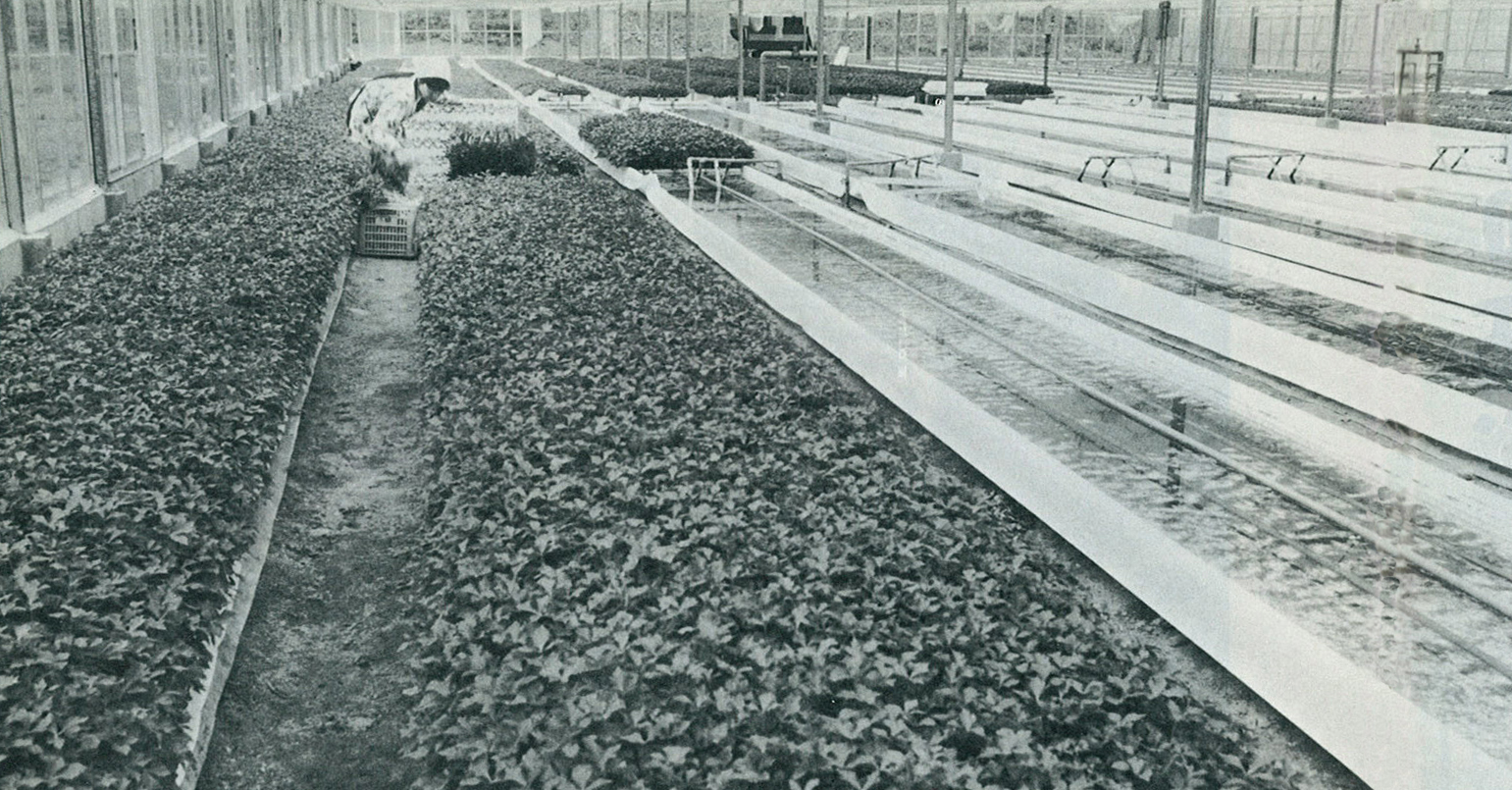 大分県では昭和52年度から、それまで以上に良質野菜の生産拡大に力を入れ、栽培ハウスの積極的な造成、生産の基礎となる土壌づくり、地域ごとに品目を決めた集団産地の育成など、流通の合理化などで強力な銘柄作りを推し進めた。写真は当時、三戸の農家で共同経営されていた「水耕みつば」。広さ13アールのガラス張りの温室にみずみずしい緑の「みつば」が栽培された。(大分市横尾)