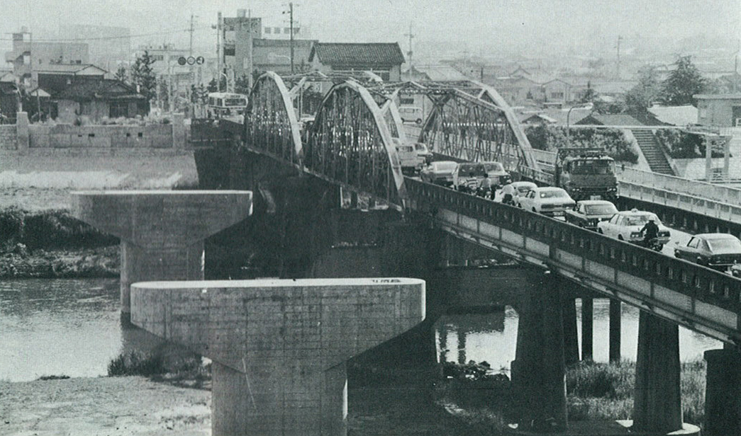 混雑緩和をめざし、二車線の橋を増設中の明磧橋(昭和52年のようす)