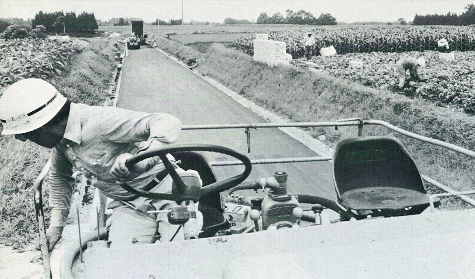 畑地帯総合土地改良事業により整備された野菜畑の中で農道の仕上げが進んでいた。(昭和52年 竹田市原山)