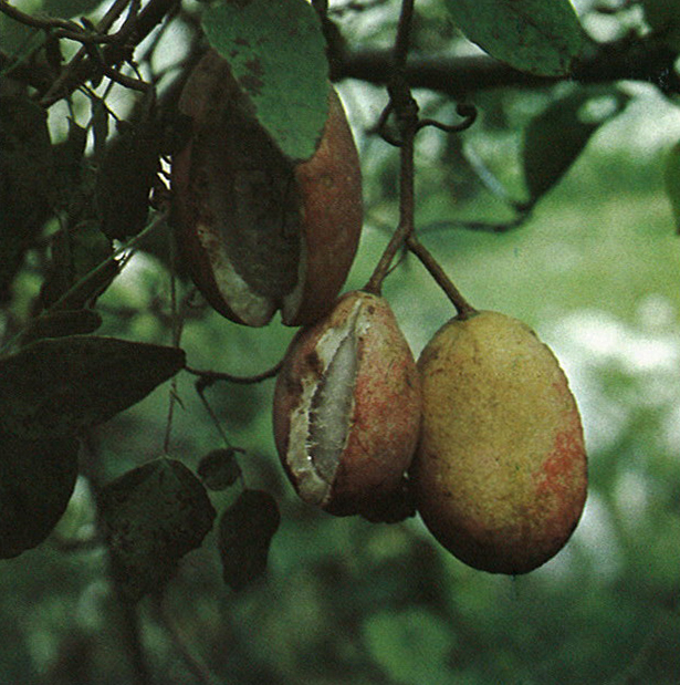 学名のAkebiaは「アケビ」。Trifoniataは「3葉の」の意。英明もThreeleaf Akebia.とされる。アケビの類は東アジアに数種あって、県内のやぶにミツバアケビのほか5葉のアケビと、ミツバアケビとアケビの間種とされるゴヨウアケビとがある。ミツバアケビのほうが産地の高所まで産する。いずれも落葉である。別に常緑のトキワアケビ(ムベ)がある。秋の味覚にかりたてられたこの果実は、今では、大人だけの郷愁になってしまったようだ。(昭和52年10月・玖珠町平家山の山ろくで)