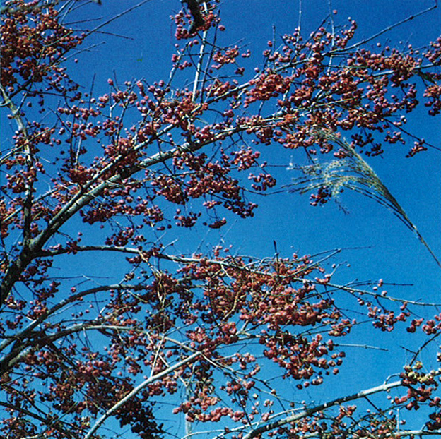 落葉低木。日当たりの良い浅いやぶに生える。おしべだけの花をつける雄株と、おしべとめしべがそろっている株とがあって、雄株は実を結ばない。梢いっぱいにつけられたマユミの実が、澄み切った晩秋の空に映える。朝夕がぐんと冷え込むようになると、1つ1つの実が四片に深く裂けて、中から赤い種子がのぞく。マユミは真弓。往時この材で弓を作ったことによる。(昭和52年11月・由布市湯布院町倉木山の山ろくで)