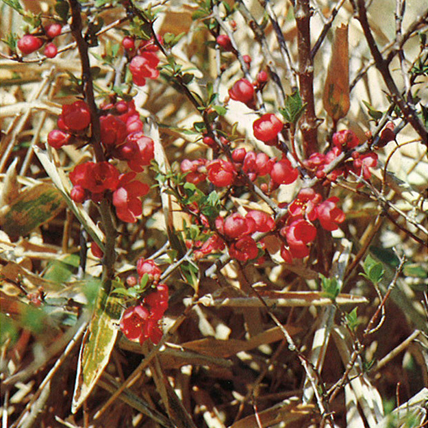 草ではなく、落葉の小低木。県内では、九重火山の山々や、そのすそ高原の原野、ササやぶを育成地とする。ふつうには、風当たりが強く日当たりの良い標高1,000メートル以上の高所に生え、一面に敷きつめたように群生することがある。春、歯に先立って赤色の花を枝いっぱいに咲かし、人知れず散って夏草に埋もれてしまう。夏の終わりには、球形の大きな果実をつけ黄熟する。この実は、長者梅と呼ばれ、果酒に用いられる。(昭和53年5月・竹田市久住町の坊ヶツルで)