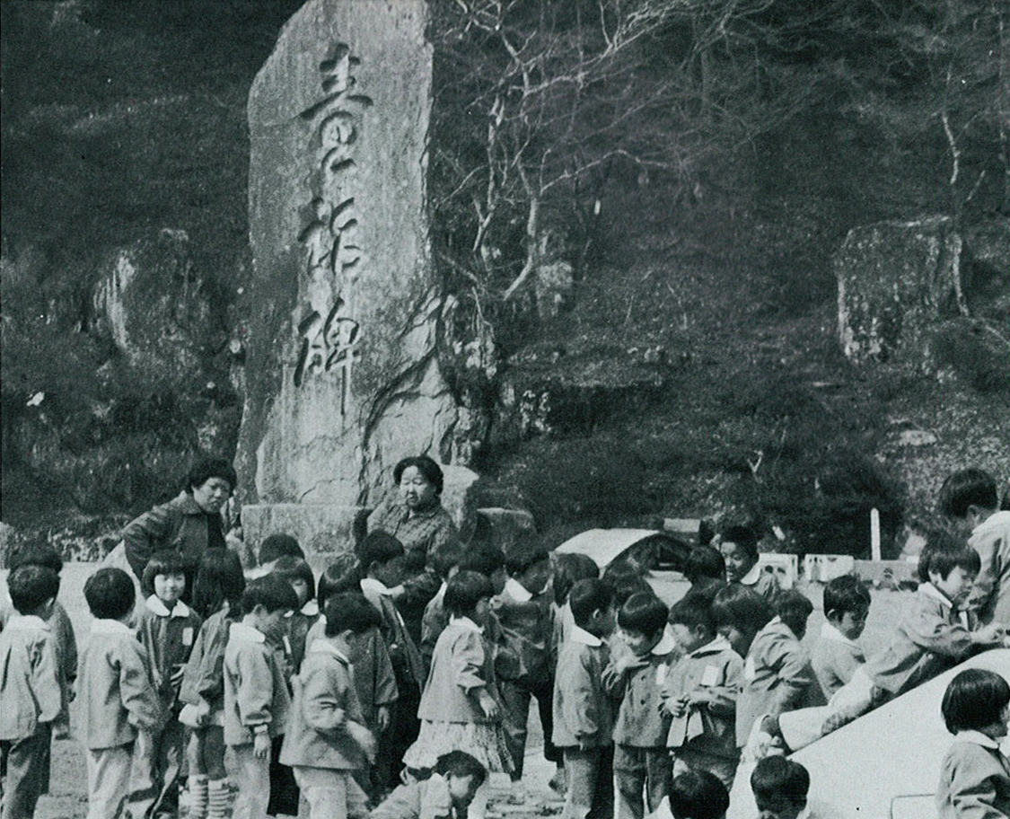見たか聞いたか豊後の森に立ても立てたよどえらい石を二丈五尺の天つき岩よ、と童話音頭にうたわれ、“童話の町”の名を一躍日本全国に広めたのは、この童話碑であった。昭和25年に日本のアンデルセンと慕われた「久留島武彦」の50年にわたる童話活動を記念して建設されたもので、日本童話祭を碑のある三島公園で行なっている。