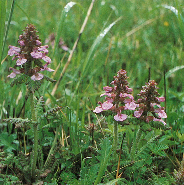 中部九州の高原だけに産する。奥別府、飯田高原、久住高原など火山を取り巻くすそ野高原の湿地周辺に蘇生し、時には、開拓された水田のあぜ斜面にも見かけることがある。花期のっ頃の草丈10~20センチメートル。やわらかい長軟毛を密生した茎に、深く整然と切れ込んだ葉4枚が輪生する。茎の頂に紅紫色の美花を多数集めて漬け、下方から花を咲かせる。あでやかな姿は、高原植物を思わせる。(昭和53年5月・玖珠町日出生台湿原で)