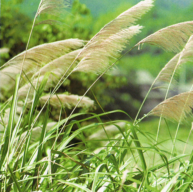 常盤ススキ。カンススキとも呼ばれる。海に近い丘陵地の土手、堤防などに群生する。ススキに似るが、さらに壮大。7月下旬には長さ30~50cmの花穂を背丈より高くそろえる。嘉穂の中軸が先のほうまで伸びているので、ススキの穂とはすぐに区別できる。優雅な花穂は、すっかり田園のふるさとになじんでしまって、盛夏に涼風を誘う。(昭和53年7月・杵築市片野の土手で)