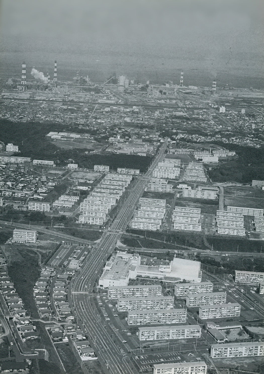大分臨海工業地帯の昭和50年頃のようす。当時の明野団地上空から撮影された。