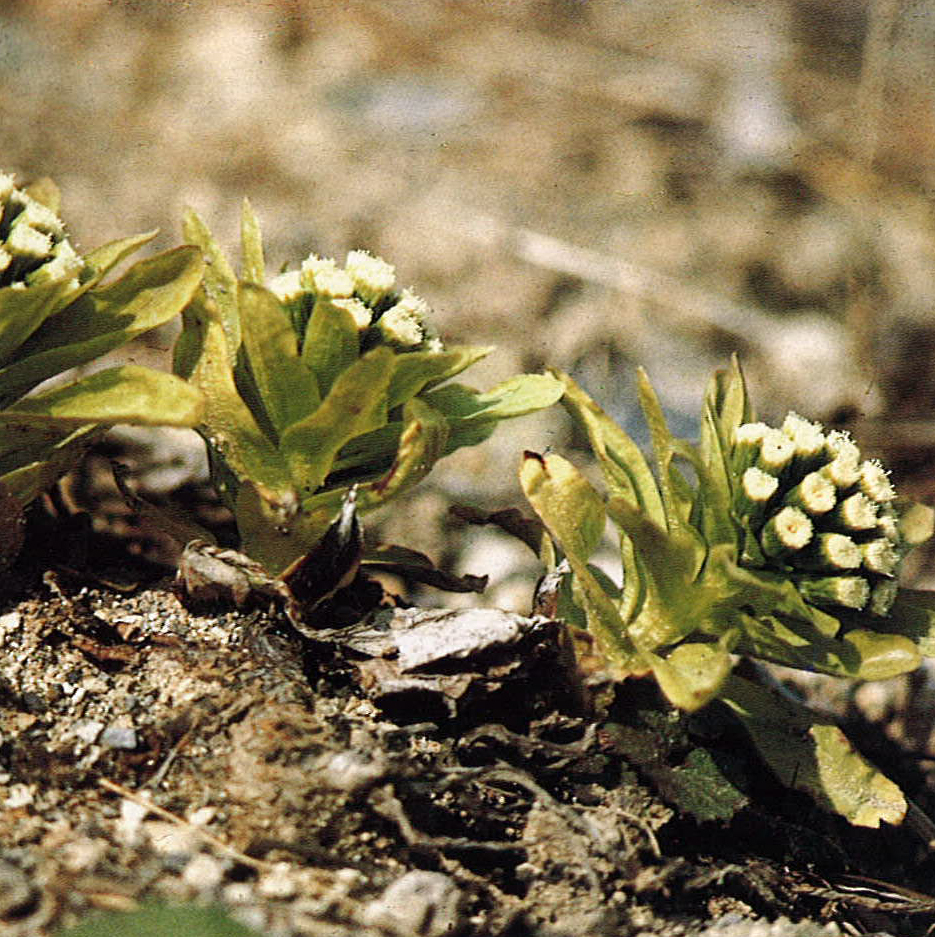 おなじみの蕗(ふき)の薹(とう)。人類文化地に住みついた植物群の一つ。日だまりの路傍や畑地、田んぼ道に土の中からひょっこりと花穂を出す。雄(お)株と雌(め)株とがあって、たくさん集まった小さい花の色や形が違う。(昭和54年3月・由布市庄内町の田んぼ道で)