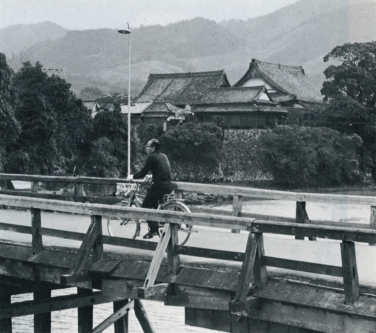 昔はどこにでも見られた木橋。水量豊かな大分県の河川のそれは切り離せない点景であった。昭和54年、耐用、安全の面からいつの間にかコンクリートの橋が幅を利かせ、数えるほどしかなくなった木橋。まもなくその命を終わらせようとしている各地の木橋を訪ねた。写真は古い家並みと調和がとれて生活のにおいがする当時の「松島橋」。(臼杵市中須賀)