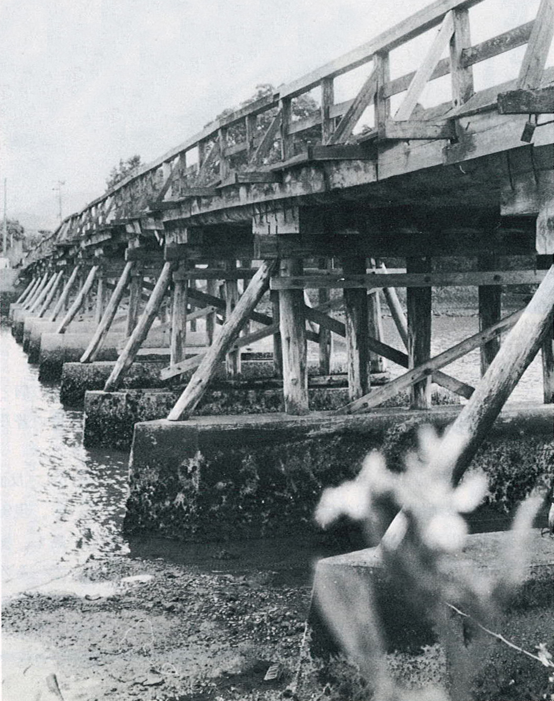 昔はどこにでも見られた木橋。水量豊かな大分県の河川のそれは切り離せない点景であった。昭和54年、耐用、安全の面からいつの間にかコンクリートの橋が幅を利かせ、数えるほどしかなくなった木橋。まもなくその命を終わらせようとしている各地の木橋を訪ねた。写真の「松島橋」は昭和34年に450万円で完成した。その木組みは力強い造形美を見せていた。(臼杵市中須賀)