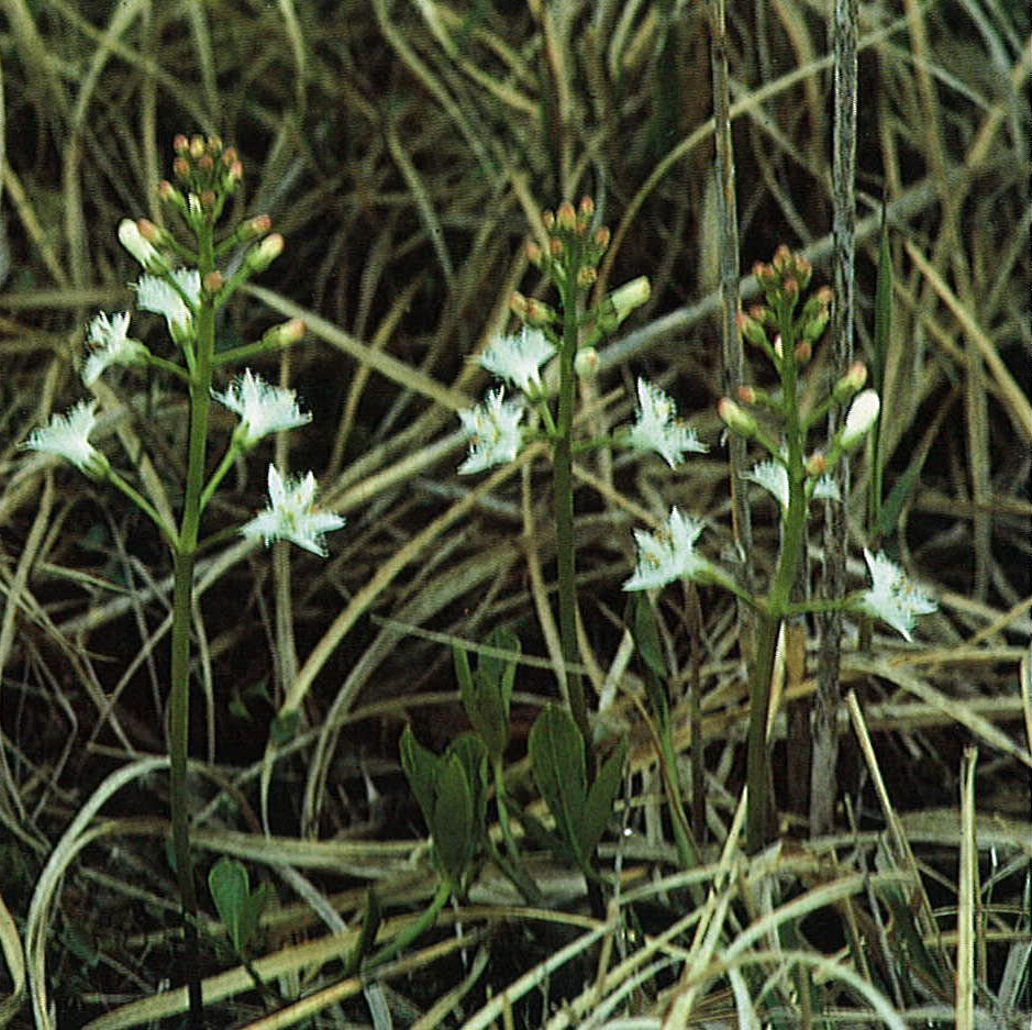 ミズゴケが生えるような高所で古い湿地に生育する。地下茎は太く横にはい、葉は長い柄があって3葉。早春、花茎とともに新葉を出す。5花冠、白毛を密生する。(昭和54年4月・由布市湯布院町小田の池の湿原で)