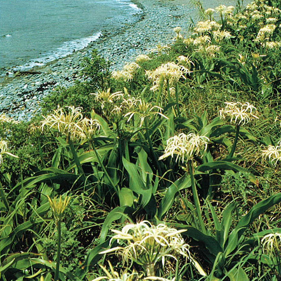 ハマユウは、関東南部以西の暖かい海岸砂地に生育するヒガンバナ科の多年草で、葉がオモトに似ていることからハマオモトともいう。県内では、県南のリアス式海岸や島の浜辺に自生の群落をつくり、夏、純白の花が照りつける陽光に映えて南国的な旅情をさそう。昭和51年の佐伯市蒲江の町花公募では圧倒的な数で票が集まり、指定町花となった。