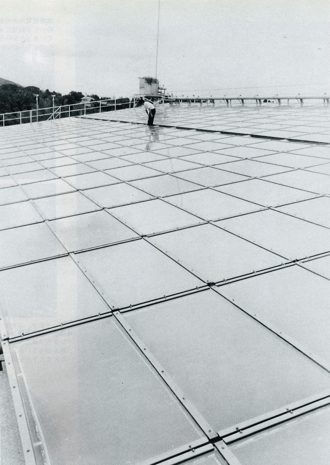 大分県は、全国でも有数の温泉地帯で、地熱資源は豊富。昭和54年にはすでに地熱発電所が二つできていた。当時の大分大学工学部では、太陽熱を利用した冷暖房が研究されており、将来、実用化できそうだと期待されていた。写真は南向き10度のこう配に取り付けられていた広さ600平方メートルの大型集熱器。
