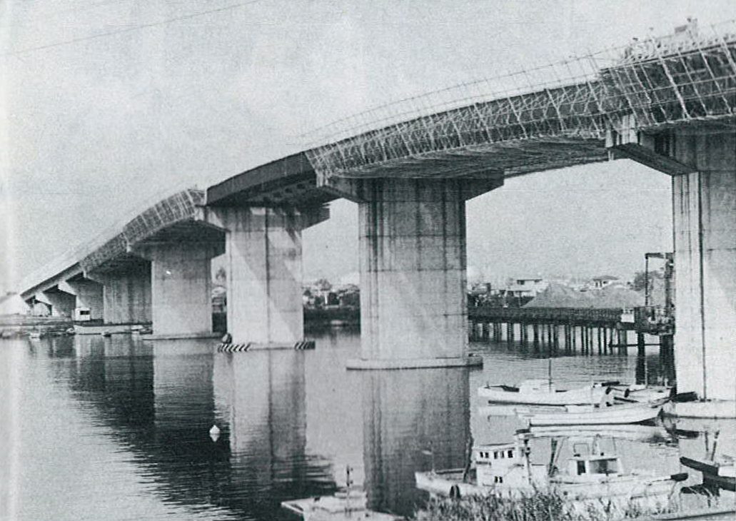 昭和55年早々の開通を目指し急ピッチに工事が進んでいた臨海産業道路家島橋のようす。