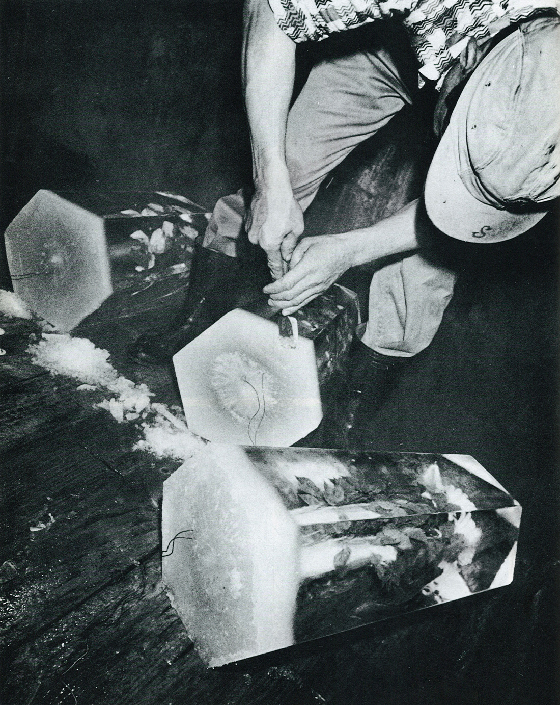 氷柱の中に生花やホンコンフラワーを閉じこめた、見るからに涼し気な花氷。夏のムシ暑さを忘れさせてくれる一服の清涼剤だ。当時、県内の製氷工場の中で、この花氷をつくっているのは別府市にある製氷工場一社だけであった。