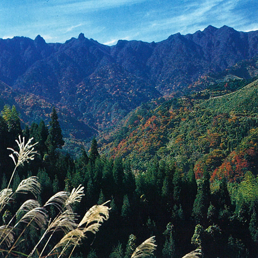 明治の中ごろまで、九州第一の高山と信じられていたのが祖母山である。この写真は、祖母・傾山群の内陣ともいえる奥岳川原流に入り込んで、祖母山(右)から南へ連なる天狗、烏帽子の岩峰群を仰いだもので、祖母山の核心とされる部分である。