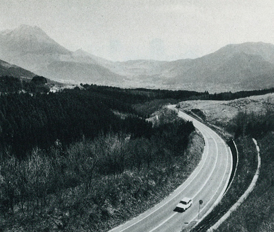 湯布院盆地を見下ろして走るバイパスのようす。(昭和56年)