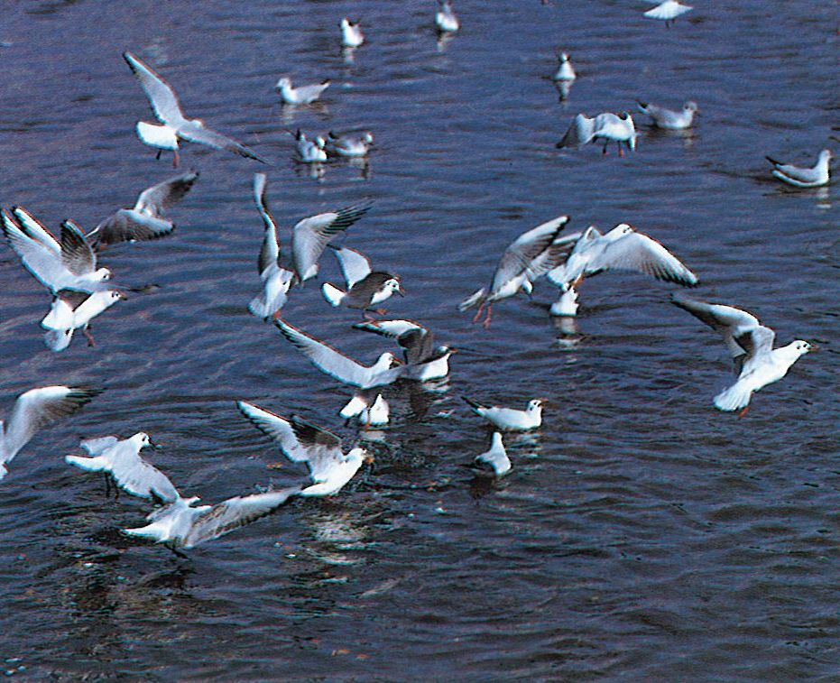 カモメ類では一番小さく、くちばしと脚が赤いのが特徴。体は白く太い。夏羽は、頭部が帽子をかぶったように黒褐色だが、冬羽は目の後方に耳かくしのような黒点があるほかは、頭部から下面にかけては白い。背面は青灰色で、全体に白っぽく見えるその姿は実に優美である。しかし、美しい姿に似ず「ギュウーイ、ギャアー」と騒がしくしわがれた声で鳴き、赤いくちばしは先がカギ形で強く、「海辺の掃除屋」と呼ばれるように腐った残飯などをよく食べる。県内では、9月中旬から翌年の5月上旬まで、各地の海岸、港湾、河口を中心に、かなり上流まで群がっているのが多く見られる。
