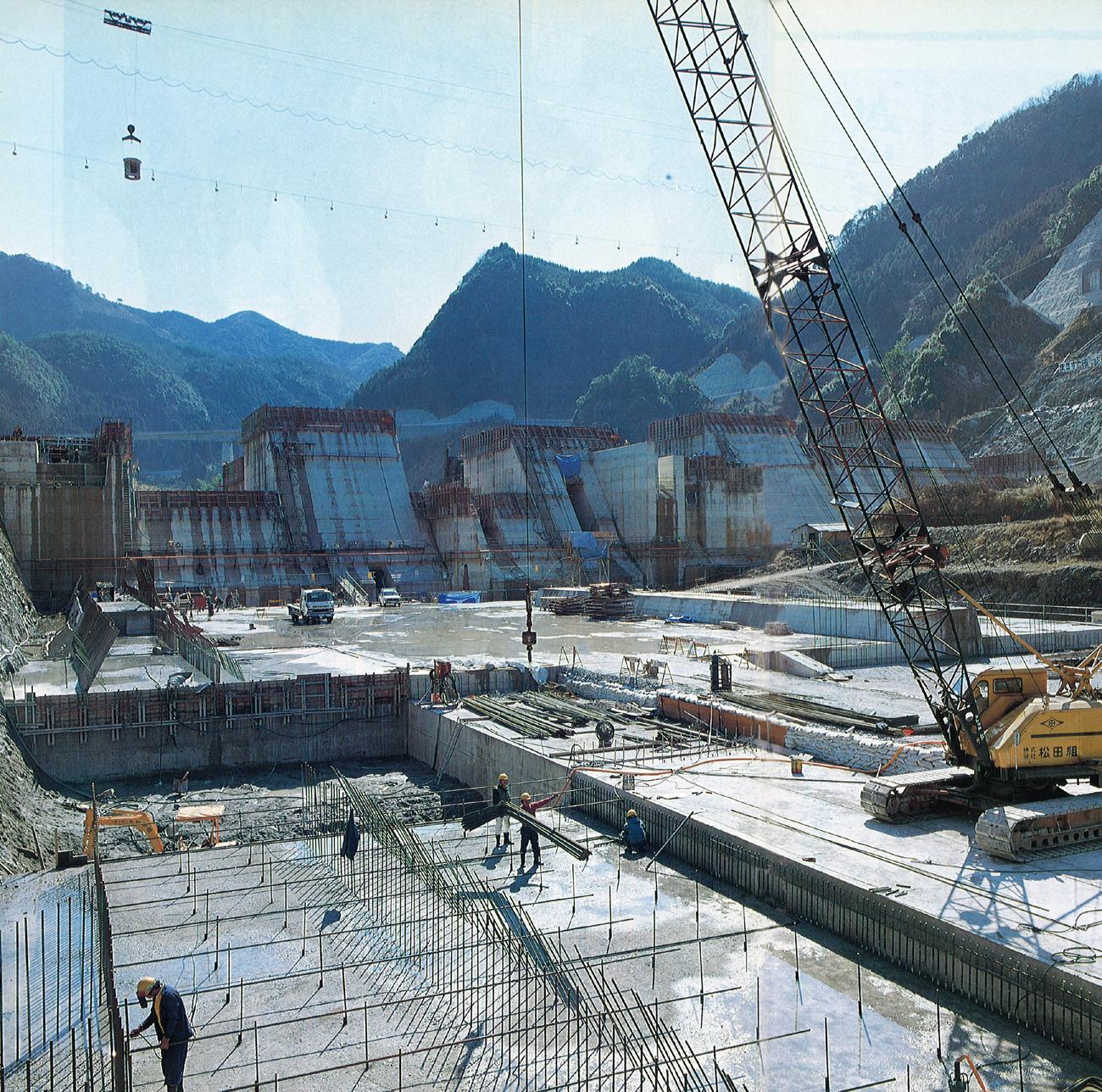 昭和57年、下流側から、エプロン越しに見る建設中の耶馬溪ダム。当時のダム本体工事の進捗状況は40%程度であったが、完成時の威容を十分想像させてくれた。堤高62m、堤頂の長さ313m、堤体積は37万立方メータの重力式コンクリートダムである。当時の県庁の建物が5~6コはすっぽりと入るほどの大きさ。有効貯水量は、2100万t。洪水調節と山国川下流域の農業用水確保が目的のほか、毎秒1.6tを放水し、県北地域の工業用水や、北九州市への飲料水の供給を見込んでいた。59年度中に、付帯工事も含めてすべてのダム工事が完了し湛水されると、その周囲は約8km。景勝の地も近く、道路事情もよいことから、格好のハイキングや、サイクリングコースが誕生した。