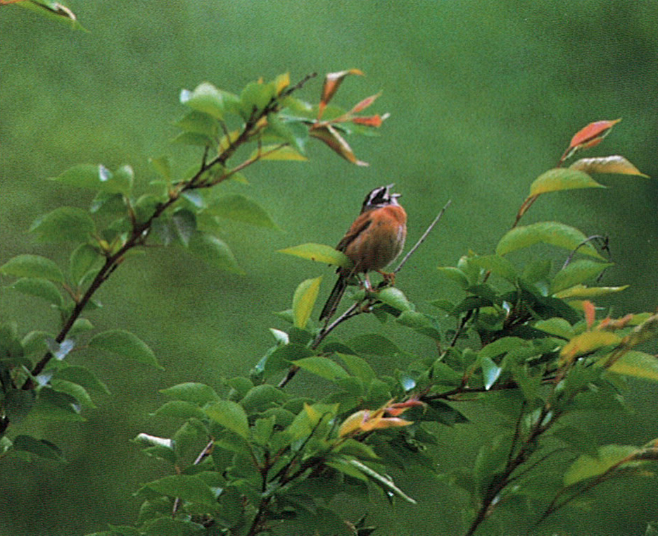 スズメよりやや大きい。ほおの白い部分と眉の白い線の間に目を通る黒い線が幅広くあるので、顔は白黒のしま模様に見える。背面は赤褐色に黒褐色の縦すじ模様があり、腰の部分の赤みも目立つ。のどは灰色で下面は赤褐色。飛ぶ時、赤褐色の尾の両端に白い羽が出るのがホオジロの特徴である。留鳥または標鳥として全国に数多く生息している。県内でも雄のホオジロが木の枝先や電線に止まってくちばしを上向けにした独特なポーズでさえずっている姿は各地でよく見られる。さえずりは、複雑な節回しのよく通る高い声で、連続して『一筆啓上仕り候』などと聞こえ、よく親しまれている。