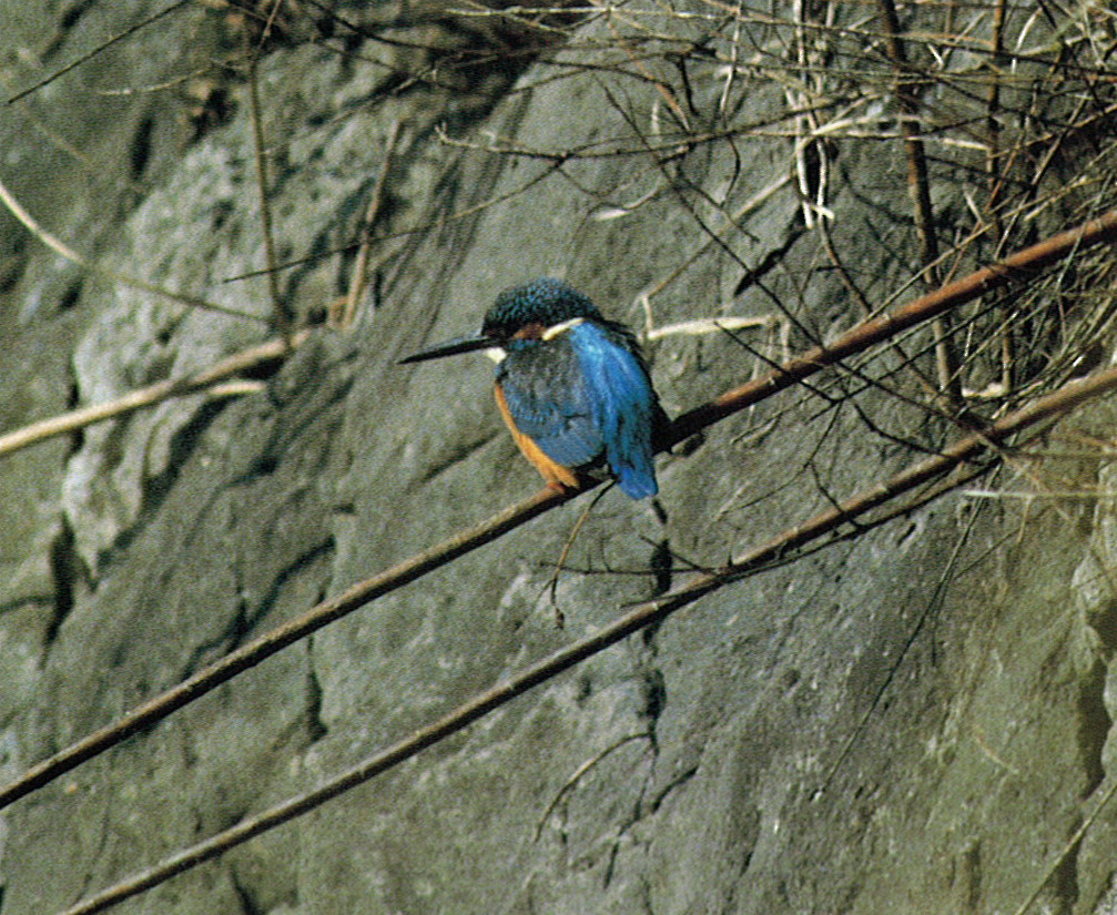 カワセミ類の中では一番小さく、スズメくらいの大きさである。体の色彩は目も覚めるような瑠璃色、特に背羽はヒスイをしのばす華麗さで、日光に映えると、きらめく宝石のような美しさである。目の下と体下面は濃い黄土色。えりの両側にある白色部は野外でよく目立つ。くちばしは体に比べて長く太く、黒い炉である。あしは短くて赤い。日本各地の池畔、河畔に見られるきわめて普通の鳥である。県内の川や沼地で、決まった横枝や石、くいなどに止まって水中の小魚を狙う姿が見かけられ、飛ぶときは水面に近い低空を一直線に飛び、『ツィーッ、ツィーッ』と鋭い金属製の声で鳴く。